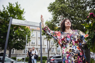 Gdańsk, ul. Podwale Staromiejskie. Odsłonięcie tablicy na skwerze im. Macieja Kosycarza. Nz. Hanna Kosycarz, żona Macieja Kosycarza