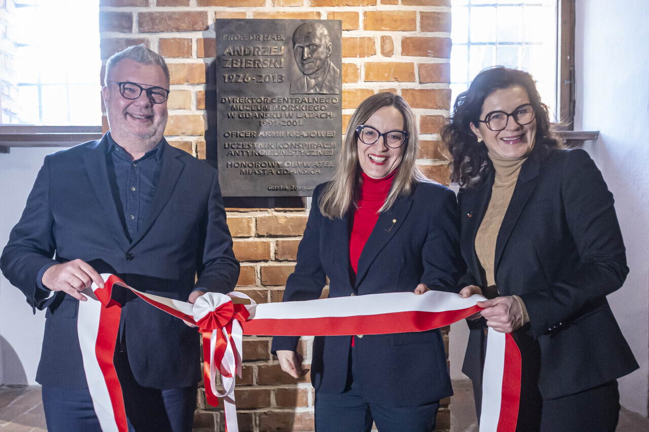 Gdańsk. Prezydent Aleksandra Dulkiewicz, Przewodnicząca Rady Miasta Agnieszka Owczarczak, Dyrektor Muzeum Gdańska dr hab. Waldemar Ossowsk, oraz dyrektorzy Szymon Kulas i dr Marcin Westphal wzięli udział w uroczystym odsłonięciu tablicy poświęconej Prof. dr hab. Andrzejowi Zbierskiemu w setną rocznicę jego urodzin. Uroczystość miała miejsce w Narodowym Muzeum Morskim na Ołowiance