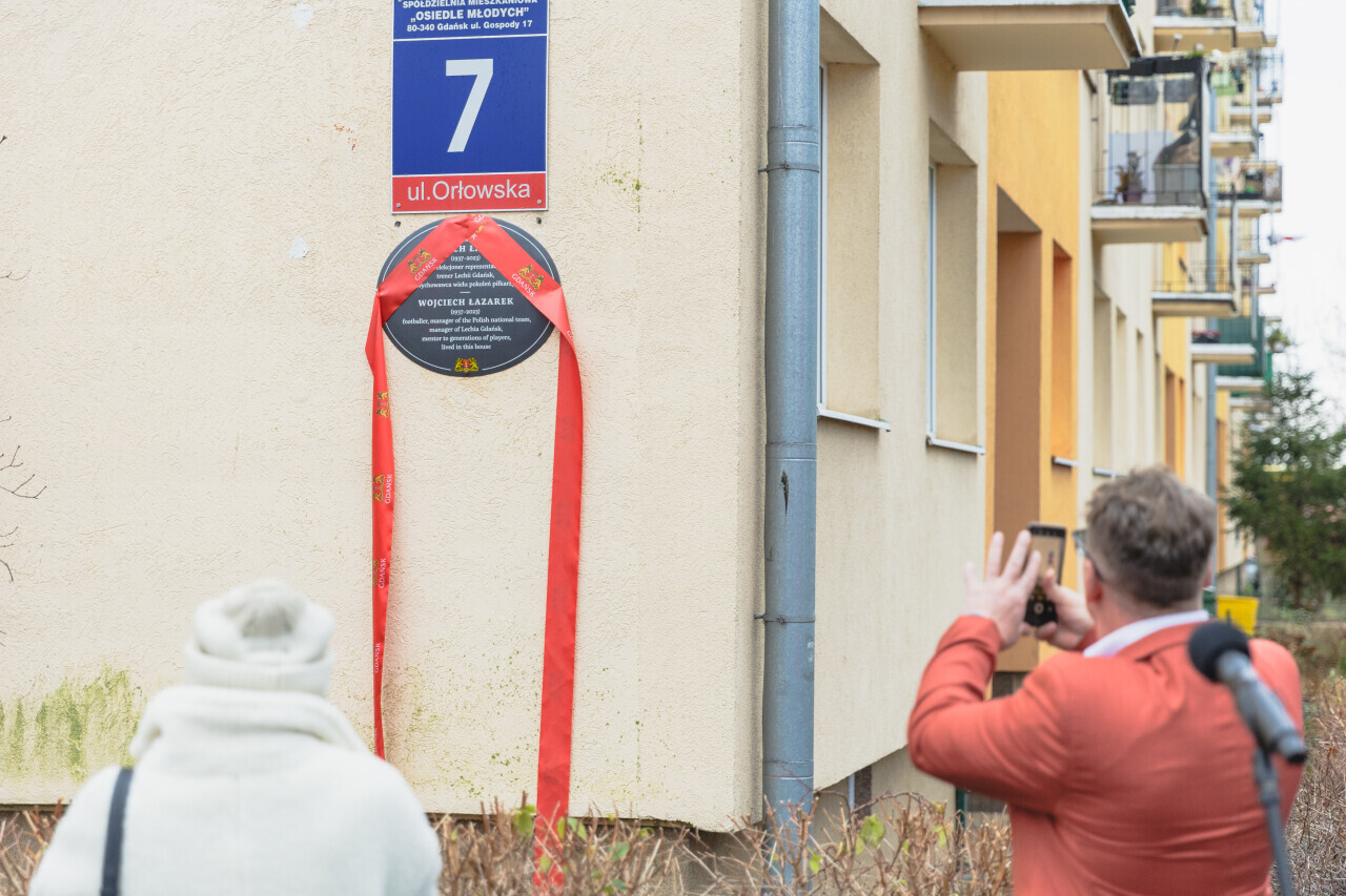 Gdańsk, ul. Orłowska 7. Odsłonięcie tablicy upamiętniającej Wojciecha Łazarka. W wydarzeniu wzięli udział m.in.: Ilona Łazarek, żona pana Wojciecha, Dorota Raczkowska, zastępczyni dyrektora Biura Prezydenta ds. Kultury, Adam Korol, dyrektor Biura Prezydenta ds. Sportu, przedstawiciel PAD, przedstawiciele Lechii Gdańsk i ŁKS Łódź oraz Waldemar Pazio, prezes Zarządu SM „Osiedle Młodych”.