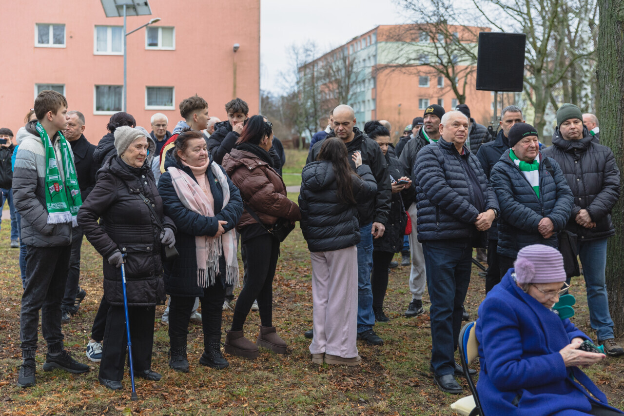 Gdańsk, ul. Orłowska 7. Odsłonięcie tablicy upamiętniającej Wojciecha Łazarka. W wydarzeniu wzięli udział m.in.: Ilona Łazarek, żona pana Wojciecha, Dorota Raczkowska, zastępczyni dyrektora Biura Prezydenta ds. Kultury, Adam Korol, dyrektor Biura Prezydenta ds. Sportu, przedstawiciel PAD, przedstawiciele Lechii Gdańsk i ŁKS Łódź oraz Waldemar Pazio, prezes Zarządu SM „Osiedle Młodych”.