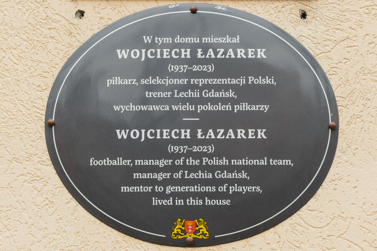 Gdańsk, ul. Orłowska 7. Odsłonięcie tablicy upamiętniającej Wojciecha Łazarka. W wydarzeniu wzięli udział m.in.: Ilona Łazarek, żona pana Wojciecha, Dorota Raczkowska, zastępczyni dyrektora Biura Prezydenta ds. Kultury, Adam Korol, dyrektor Biura Prezydenta ds. Sportu, przedstawiciel PAD, przedstawiciele Lechii Gdańsk i ŁKS Łódź oraz Waldemar Pazio, prezes Zarządu SM „Osiedle Młodych”.
