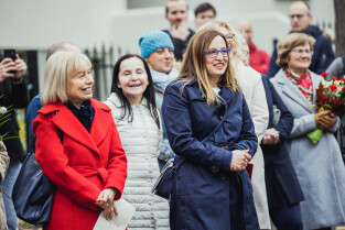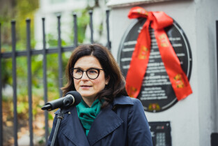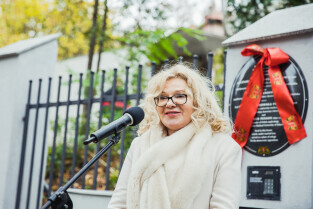 Gdańsk, ul. Tuwima 29. Odsłonięcie tablicy upamiętniającej honorową obywatelkę Gdańska, profesor Joanna Muszkowska-Penson. Nz. Aleksandra Dulkiewicz, prezydent Gdańska