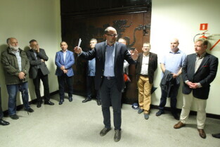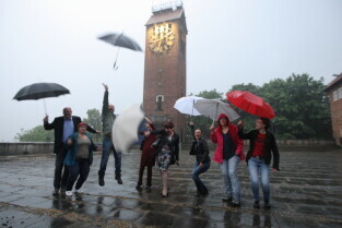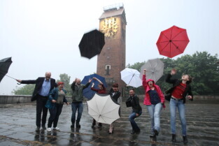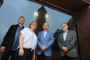 Gdańsk. Schronisko młodzieżowe im. Pawła Beneke. Odsłonięcie zegara na Biskupiej Górce. Nz. Tomasz Sulak-Elfracorr, Agata Biały-Fundacja Gdańska, Tomasz Dmowski-Elfracorr i Grzegorz Szychliński-MHMG.