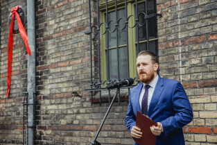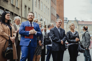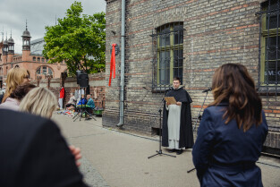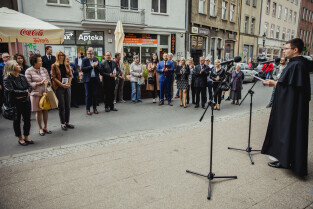 Gdańsk, przy kościele św. Mikołaja. Odsłonięto tablicę upamiętniającą księdza Magnusa Bruskiego. Nz. Przemysław Szamocki
