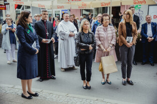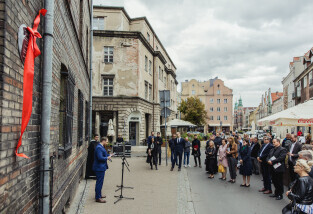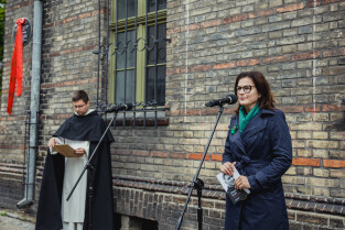 Gdańsk, przy kościele św. Mikołaja. Odsłonięto tablicę upamiętniającą księdza Magnusa Bruskiego. Nz. Prezydent Gdańska, Aleksandra Dulkiewicz