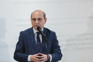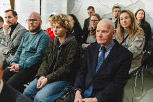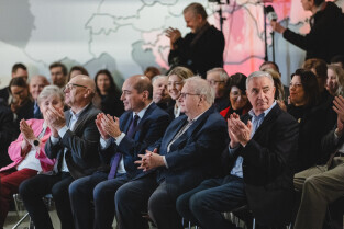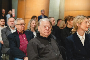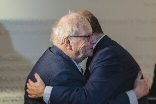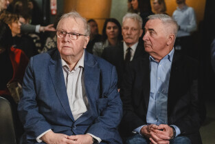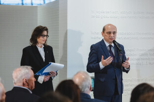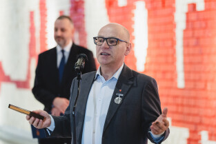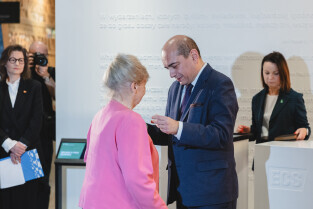 Gdańsk, ECS. Odznaka Solidarności i Praw Człowieka. Nz. Aleksander Hall – działacz opozycji demokratycznej w PRL, polityk, nauczyciel akademicki, współzałożyciel Ruchu Młodej Polski, doradca Lecha Wałęsy, uczestnik obrad Okrągłego Stołu, członek Kolegium Historyczno-Programowego ECS