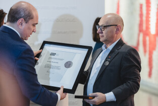 Gdańsk, ECS. Odznaka Solidarności i Praw Człowieka. Nz. Jerzy Borowczak – działacz opozycji demokratycznej w PRL, polityk, inicjator strajku sierpniowego w Stoczni Gdańskiej im. Lenina, aktywnie włączający się w program ECS