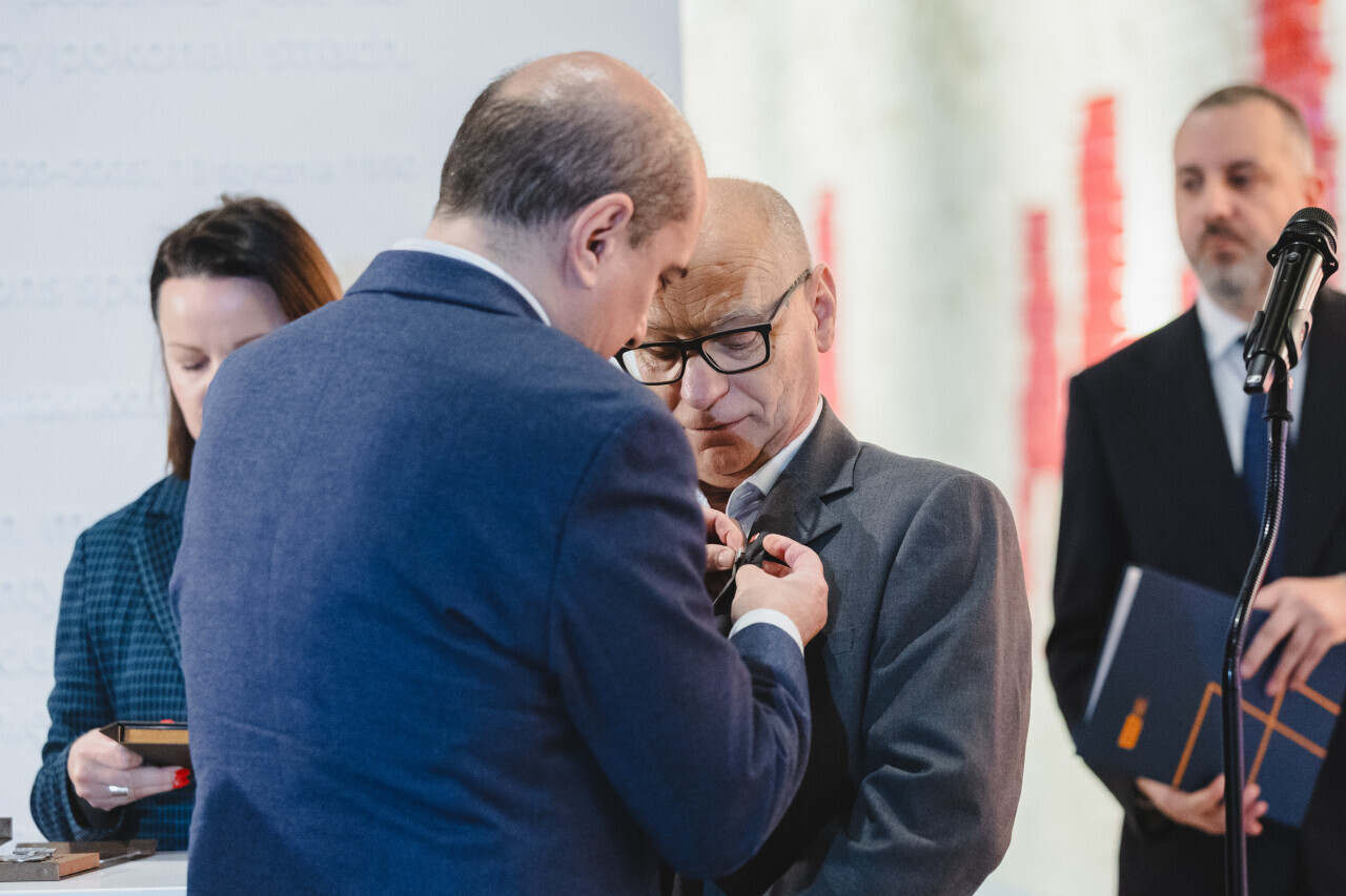 Gdańsk, ECS. Odznaka Solidarności i Praw Człowieka. Nz. Jerzy Borowczak – działacz opozycji demokratycznej w PRL, polityk, inicjator strajku sierpniowego w Stoczni Gdańskiej im. Lenina, aktywnie włączający się w program ECS