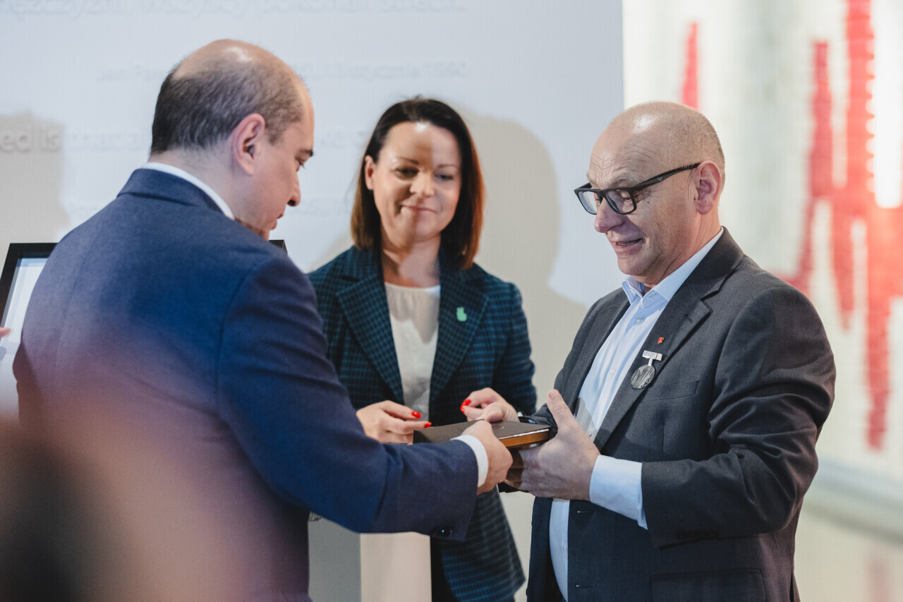 Gdańsk, ECS. Odznaka Solidarności i Praw Człowieka. Nz. Jerzy Borowczak – działacz opozycji demokratycznej w PRL, polityk, inicjator strajku sierpniowego w Stoczni Gdańskiej im. Lenina, aktywnie włączający się w program ECS