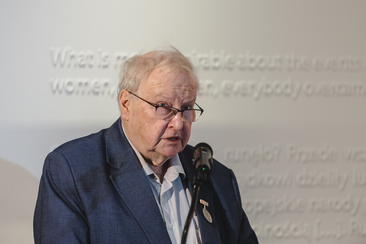 Gdańsk, ECS. Odznaka Solidarności i Praw Człowieka. Nz. Aleksander Hall – działacz opozycji demokratycznej w PRL, polityk, nauczyciel akademicki, współzałożyciel Ruchu Młodej Polski, doradca Lecha Wałęsy, uczestnik obrad Okrągłego Stołu, członek Kolegium Historyczno-Programowego ECS