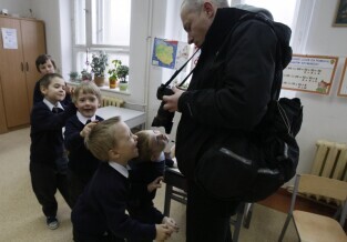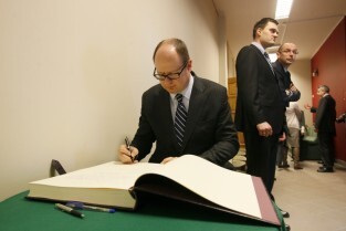Oficjalne otwarcie wyremontowanej placówki edukacyjnej "Fregata", prowadzonej przez Stowarzyszenie SKWER. Gdańsk Oliwa. Nz. Prezydent Gdańska Paweł Adamowicz wpisuje się do pamiątkowej księgi