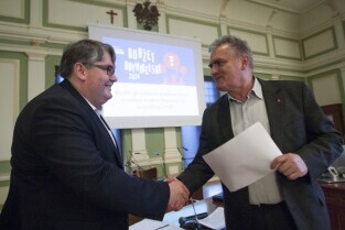 Gdańsk, Nowy Ratusz. Ostatnie posiedzenie Zespołu Konsultacyjnego, podczas którego nastąpiło ogłoszenie wyników głosowania nad wnioskami Budżetu Obywatelskiego 2014. Nz. Pełnomocnik Prezydenta Gdańska ds. Inicjatyw i Konsultacji Społecznych Piotr Kowalczuk (po lewej) i Przewodniczący Rady Miasta Gdańska Bogdan Oleszek