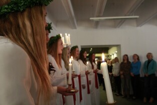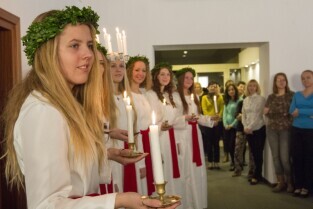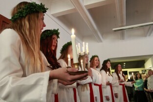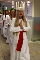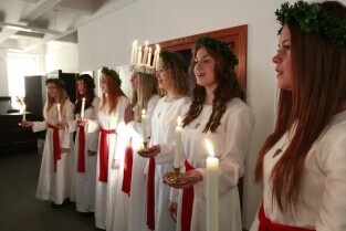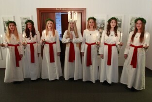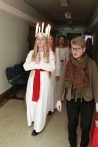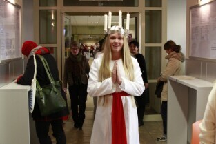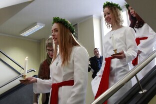 Urząd Miejski w Gdańsku. Tradycyjny Orszak św. Łucji ze szwedzkiego Kalmaru, który zwiastuje zbliżające się święta Bożego Narodzenia.