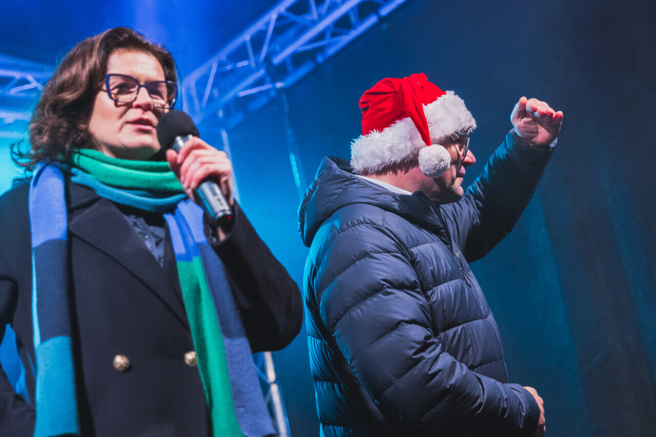 Gdańsk. Orunia - Św. Wojciech - Lipce. Uroczyste rozświetlenie choinki i dzielnicowy jarmark. Obecna była Aleksandra Dulkiewicz, prezydent Gdańska