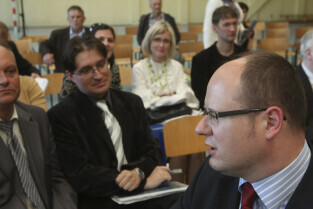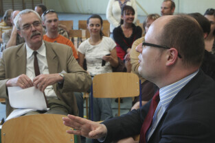 Spotkanie obywatelskie Prezydenta Gdańska z mieszkańcami dzielnic: Orunia, Św. Wojciech, Lipce. Gdańsk, sal gimnastyczna Zespołu Szkół Inżynierii Środowiska. Nz. Prezydent Gdańska Paweł Adamowicz i Dyrektor Biura Rozwoju Gdańska Marek Piskorski
