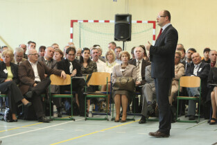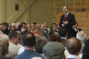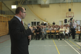 Spotkanie obywatelskie Prezydenta Gdańska z mieszkańcami dzielnic: Orunia, Św. Wojciech, Lipce. Gdańsk, sal gimnastyczna Zespołu Szkół Inżynierii Środowiska. Nz. Prezydent Gdańska Paweł Adamowicz
