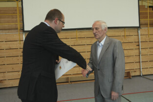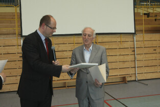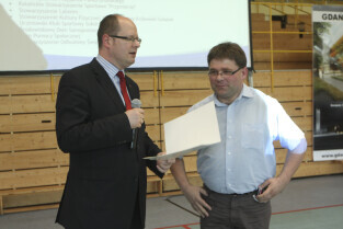 Spotkanie obywatelskie Prezydenta Gdańska z mieszkańcami dzielnic: Orunia, Św. Wojciech, Lipce. Gdańsk, sal gimnastyczna Zespołu Szkół Inżynierii Środowiska. Nz. Prezydent Gdańska Paweł Adamowicz przyznaje nagrodę, którą otrzymuje Prezes Stowarzyszenia Inicjatyw Lokalnych Orunia Aleksander Nagucki