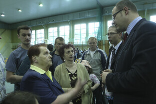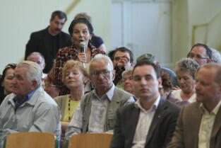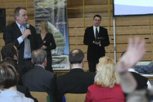 Spotkanie obywatelskie Prezydenta Gdańska z mieszkańcami dzielnic: Orunia, Św. Wojciech, Lipce. Gdańsk, sal gimnastyczna Zespołu Szkół Inżynierii Środowiska. Nz. (po prawej) z mieszkańcami rozmawia Maciej Lorek, Dyrektor Wydziału Środowiska UMG
