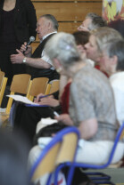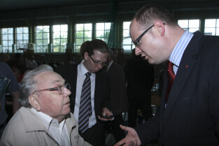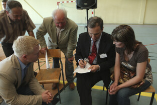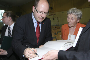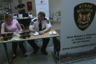 Spotkanie obywatelskie Prezydenta Gdańska z mieszkańcami dzielnic: Orunia, Św. Wojciech, Lipce. Gdańsk, sal gimnastyczna Zespołu Szkół Inżynierii Środowiska. Nz. Prezydent Gdańska Paweł Adamowicz wpisuje się do Kroniki Parafii św. Jana Bosko w Gdańsku Orunii