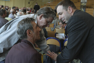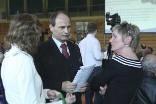 Spotkanie obywatelskie Prezydenta Gdańska z mieszkańcami dzielnic: Orunia, Św. Wojciech, Lipce. Gdańsk, sal gimnastyczna Zespołu Szkół Inżynierii Środowiska. Nz. (po środku) z mieszkańcami rozmawia Dimitris T. Skuras, Dyrektor Wydziału Gospodarki Komunalnej UMG