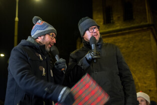 Gdańsk. Oruńska Choinka i uroczyste otwarcie Parku Oruńskiego po rewaloryzacji. Nz. Andrzej Stawicki i Prezydent Gdańska Paweł Adamowicz