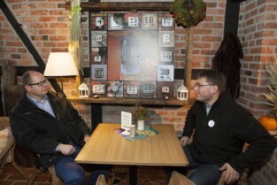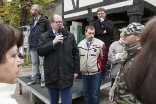Gdańsk Orunia, ul. Gościnna. Festyn "Oruńskie Kujemy" w zabytkowej kuźni. Nz. Piotr Wróblewski (Gdańska Fundacja Innowacji Społecznej), po lewej Adam Stawicki (Fundacja Rozwoju Integracji Społecznej AKCES)
