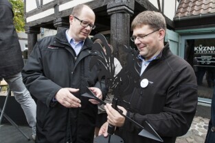 Gdańsk Orunia, ul. Gościnna. Festyn "Oruńskie Kujemy" w zabytkowej kuźni. Nz. Prezydent Gdańska Paweł Adamowicz i Piotr Wróblewski (Gdańska Fundacja Innowacji Społecznej)