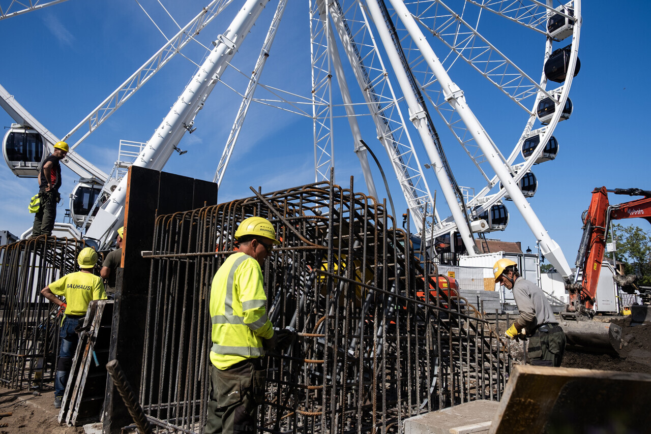 Gdańsk. Koło widokowe AmberSky czynne będzie do końca sierpnia 2025 roku. Równocześnie trwają prace budowlane pod montaż nowego koła, które zostanie uruchomione w styczniu 2026 roku.