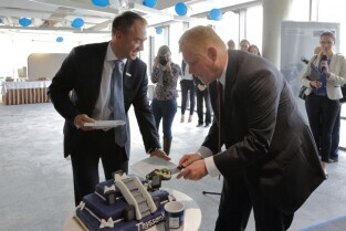 Olivia Business Centre w Gdańsku. Otwarcie Biura Globalnego Centrum Usług Wspólnych firmy ThyssenKrupp. Nz Rober Góra - dyrektor ThyssenKrupp Group Service Gdansk i Guido Kerkhoff - Dyrektor Finansowy ThyssenKrupp AG.