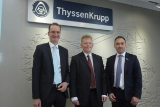Olivia Business Centre w Gdańsku. Otwarcie Biura Globalnego Centrum Usług Wspólnych firmy ThyssenKrupp. Nz Nz Lars Hoelzer - dyrektor Globalnych Uslug Wspolnych w ThyssenKrupp, Guido Kerkhoff - Dyrektor Finansowy ThyssenKrupp AG. oraz Rober Gora - dyrektor ThyssenKrupp Group Service Gdansk.