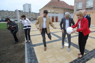 Gdańsk. Otwarcie Boiska Wielofunkcyjnego w Szkole Podstawowej 17. Nz. Grzegorz Kryger-Wydział Rozwoju Społecznego, Barbara Sławińska Dyrektor Szkoły, Wojciech Błaszkowski-Wiceprzewodniczący Rady Miasta i Radny Andrzej Kowalczys.