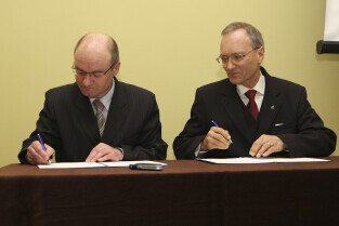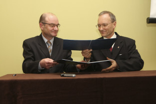 Otwarcie Centrum Wiedzy i Przedsiębiorczości Politechniki Gdańskiej. Gdańsk, willa przy al. Zwycięstwa 27. Nz. Janusz Rachoń, były Rektor PG i Paweł Adamowicz, Prezydent Gdańska