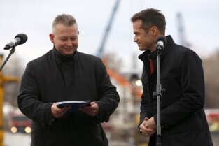 Gdańsk. Otwarcie II etapu Trasy Sucharskiego łączącego ul. Wosia Budzysza i Węzeł ku Ujściu. Nz. od lewej: Z-ca Prezydenta Gdańska Andrzej Bojanowski i Minister Transportu, Budownictwa i Gospodarki Morskiej Sławomir Nowak, który przekazuje dokument dofinansowania gdańskich inwestycji
