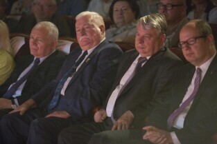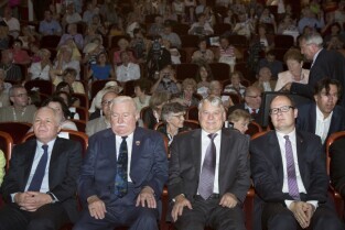 Gdańsk, Teatr Wybrzeże. Uroczystość otwarcia IV Zjazdu Gdańszczan oraz I Kongres Gedanistyczny. Nz. były Premier RP Jan Krzysztof Bielecki, były Prezydent RP Lech Wałęsa, Marszałek Senatu RP Bogdan Borusewicz, Prezydent Gdańska Paweł Adamowicz