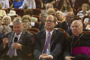 Gdańsk, Teatr Wybrzeże. Uroczystość otwarcia IV Zjazdu Gdańszczan oraz I Kongres Gedanistyczny. Nz. od lewej: Marszałek Senatu RP Bogdan Borusewicz, Prezydent Gdańska Paweł Adamowicz, Abp Senior Tadeusz Gocłowski