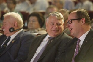 Gdańsk, Teatr Wybrzeże. Uroczystość otwarcia IV Zjazdu Gdańszczan oraz I Kongres Gedanistyczny. Nz. od lewej: były Premier RP Jan Krzysztof Bielecki, były Prezydent RP Lech Wałęsa, Marszałek Senatu RP Bogdan Borusewicz