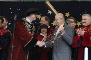 Parada oraz przedstawienie na otwarcie Jarmarku św. Dominika w Gdańsku. Nz. Prezydent Gdańska Paweł Adamowicz przekazuje kupcą klucze do miasta, które odbiera Prezes MTG SA Andrzej Kasprzak
