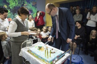Poznać świat przez dotyk. Otwarcie Sali Doświadczania Świata w Niepublicznym Integracyjnym Punkcie Przedszkolnym "Mali Przyjaciele". Gdańsk Ujeścisko. Nz. Dyrektor placówki Iwona Kalinowska i Prezydent Gdańska Paweł Adamowicz