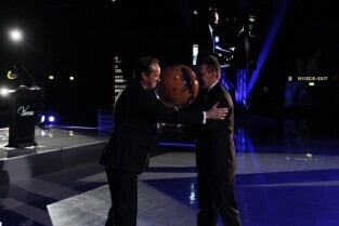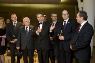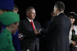 Port Lotniczy Gdańsk im. Lecha Wałęsy. Otwarcie T2 - nowego terminala pasażerskiego. Nz. Prezes Portu Lotniczego Gdańsk Tomasz Kloskowski wręcza podziękowanie (statuetki "Bursztynowe Bączki") za wkład w budowę nowego terminala, które otrzymuje Z-ca Prezydenta Gdańska Andrzej Bojanowski