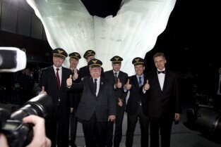 Port Lotniczy Gdańsk im. Lecha Wałęsy. Otwarcie T2 - nowego terminala pasażerskiego. Nz. Marszałek Woj. Pomorskiego Mieczysław Struk składa gratulacje i przekazuje symboliczny globus Prezesowi Portu Lotniczego Gdańsk Tomaszowi Kloskowskiemu