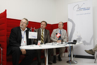 Nz. konferencja prasowa poświęcona otwarciu Terminalu Miasto - placówki trójmiejskiego Portu Lotniczego im. Lecha Walesy. Od lewej: Włodzimierz Machczyński (Prezes Portu Lotniczego), Mieczysław Struk (wicemarszałek woj. pomorskiego) oraz Paweł Adamowicz (Prezydent Gdańska).
