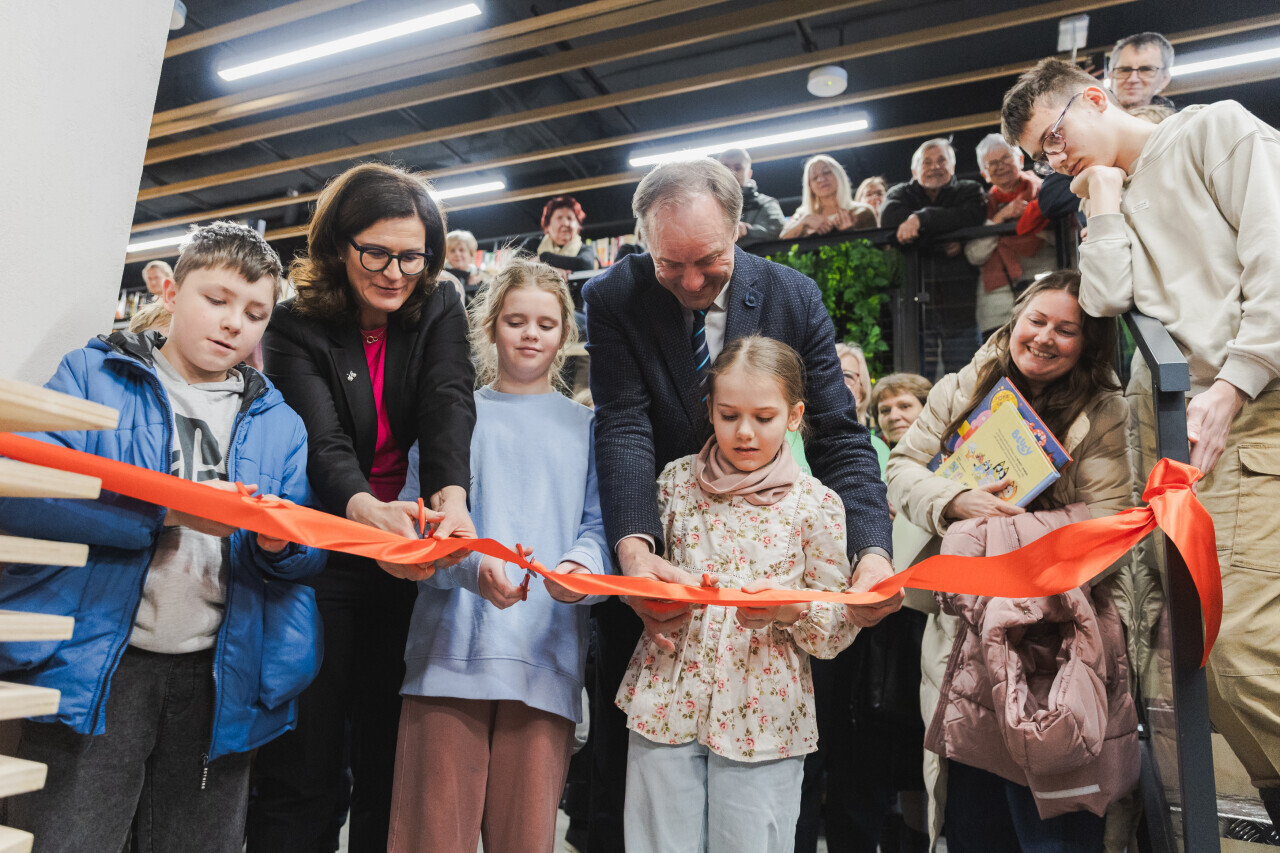 Gdańsk, ul. Łódzka Otwarcie biblioteki Dobry Moment. W wydarzeniu brali udział m.in. Mieczysław Struk, marszałek województwa pomorskiego, Aleksandra Dulkiewicz, prezydent Gdańska, Jarosław Zalesiński, dyrektor Wojewódzkiej i Miejskiej Biblioteki Publicznej w Gdańsku i Katarzyna Kowalewska, kierowniczka filii.
