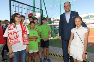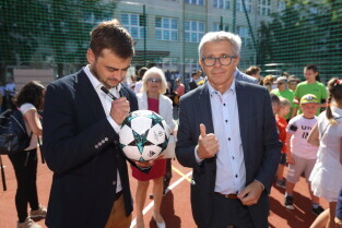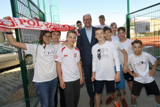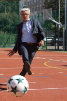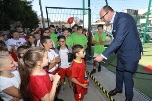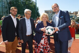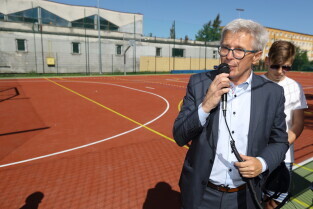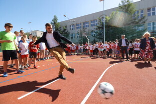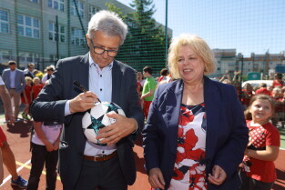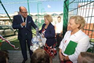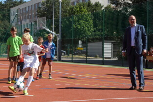 Gdańsk, Szkoła Podstawowa nr 7. Otwarcie boiska. Nz. Prezydent Gdańska Paweł Adamowicz.