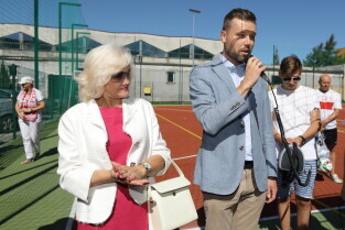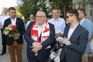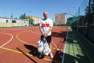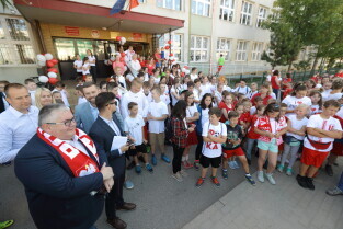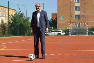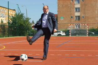 Gdańsk, Szkoła Podstawowa nr 7. Otwarcie boiska. Nz. Radny Mariusz Andrzejczak.
