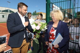 Gdańsk, Szkoła Podstawowa nr 7. Otwarcie boiska. Nz. Radny Mariusz Andrzejczak i Dyrektor Szkoły Hanna Derecka.