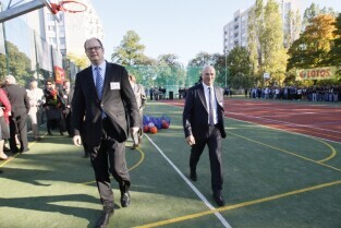 Gdańsk Przymorze, Gimnazjum nr 20. Otwarcie 13. boiska w ramach programu "Junior Gdańsk 2012". Sponsorem budowy obiektu jest Grupa LOTOS SA. Nz. Prezes Grupy LOTOS SA Paweł Olechnowicz i Prezydent Gdańska Paweł Adamowicz (po prawej)