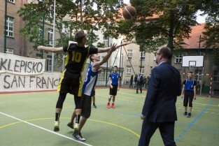 Gdańsk Wrzeszcz. Otwarcie boiska przyszkolnego przy III Liceum Ogólnokształcącym. Nz. Prezydent Gdańska Paweł Adamowicz