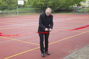 W setną rocznicę przyłączenia Stogów do Gdańska uroczyście otworzono nowe przyszkolene boisko. Szkoła Podstawowa nr 11 przy ul. Stryjewskiego 28. Nz. przemawia Marcin Sztucki Dyrektor Biura Zarządu Fundacji Gdańskiej.
