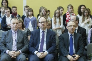 Gdańsk Przymorze. Szkoła Podstawowa nr 44 przy ul. Jagiellońskiej. Otwarcie wyremontowanego boiska wielofunkcyjnego. Nz. od lewej: szef Dyrekcji Rozbudowy Miasta Gdańska Włodzimierz Bartosiewicz, Prezydent Gdańska Paweł Adamowicz, Poseł na Sejm RP Jerzy Borowczak