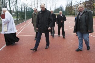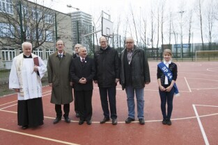 Gdańsk Przymorze. Szkoła Podstawowa nr 44 przy ul. Jagiellońskiej. Otwarcie wyremontowanego boiska wielofunkcyjnego. Nz. od lewej: Proboszcz Parafii pw. św. Józefa ks. Krzysztof Glaza, Radny Miasta Gdańska Krzysztof Wiecki, Dyrektor SP nr 44 Maciej Barański, Prezydent Gdańska Paweł Adamowicz, Radny Miasta Gdańska Grzegorz Strzelczyk
